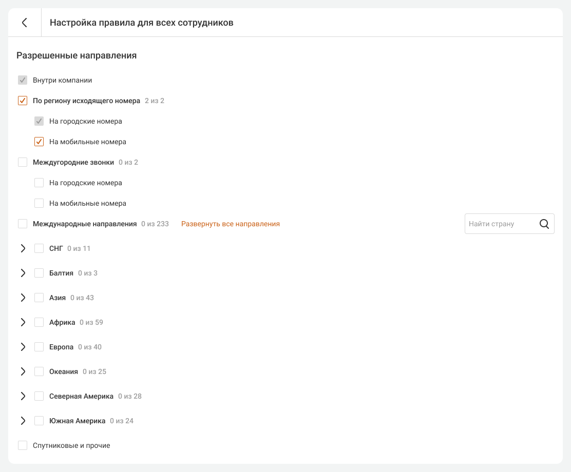 Выберите направления звонков, которые хотите разрешить для сотрудников.