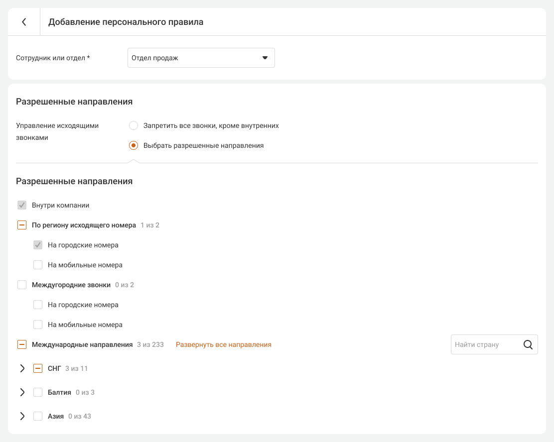 После добавления персональных правил звонков для конкретного сотрудника или отдела нажмите «Сохранить». Проверьте, что сохраненный список выбранных вами направлений составлен верно.