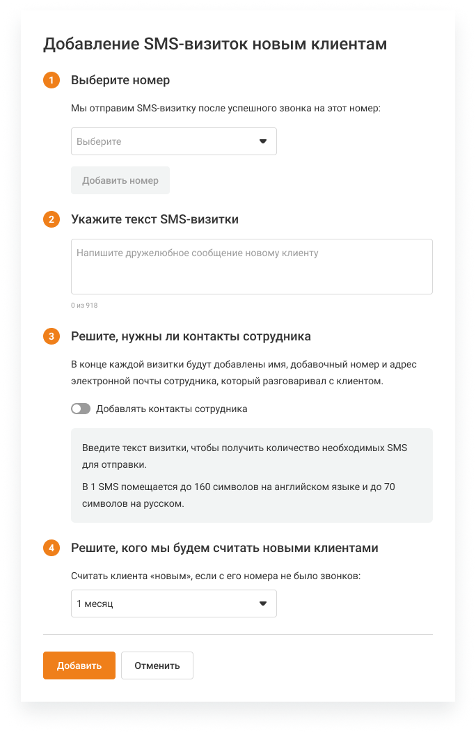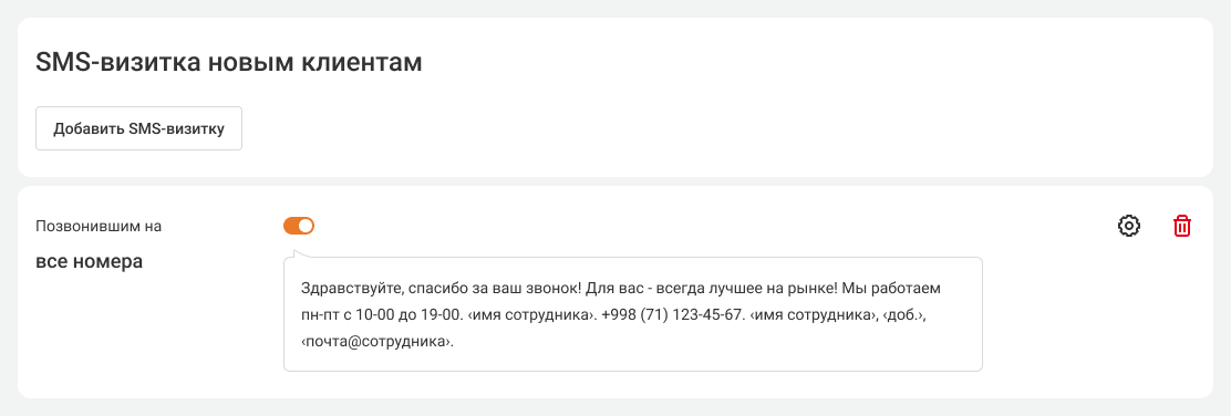 Настройте текст приветственной SMS. Также вы можете настроить, чтобы в SMS автоматически вставлялись контакты сотрудника, с которым говорил клиент (контакты берутся из данных о сотрудниках), настроить время, когда клиент считается новым, а также включить разные SMS-визитки для ваших номеров.