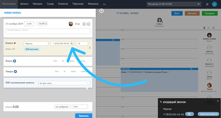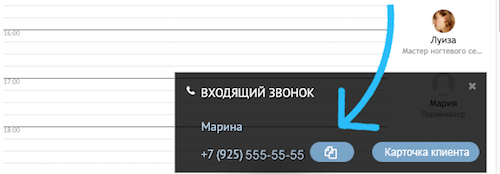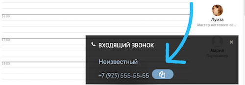 Для того, чтобы создать запись в расписании на этого клиента, нажмите на иконку “Копировать” в окне телефонии, а в окне новой записи нажмите на иконку “Вставить”.