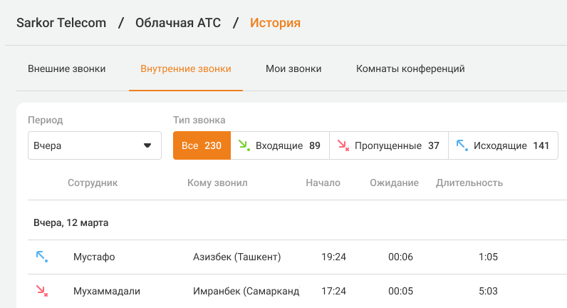 Все, теперь вы можете совершать и переводить звонки по коротким (внутренним) номерам между Облачными АТС. Такие вызовы будут отображаться в Истории → Внутренние вызовы, и их можно будет прослушать. В колонке «Кому звонил» в скобках будет указано название филиала, к которому относится сотрудник.