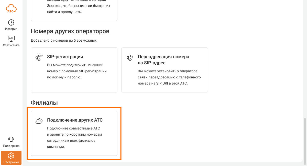 Перейдите в раздел «Еще», в самом низу перейдите в раздел «Филиалы» – «Подключение других АТС».