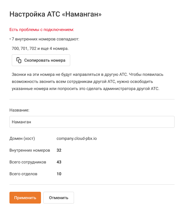 Это не будет препятствовать подключению одной АТС к другой, однако сотрудникам, которые имеют пересекающиеся номера, нельзя будет позвонить из другой АТС. При подключении появится сообщение с предупреждением: