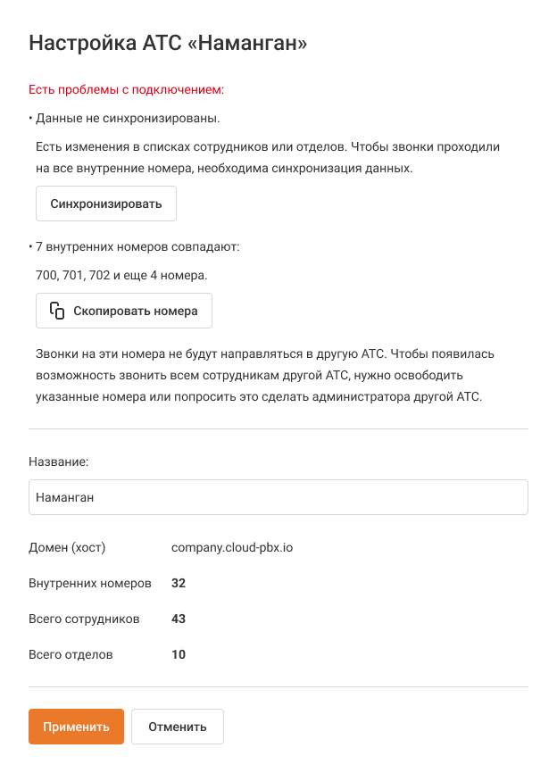 Если автосинхронизация не произошла, в настройках подключения к другой АТС появится кнопка «Синхронизировать». Нажмите ее, чтобы выполнить синхронизацию вручную.
