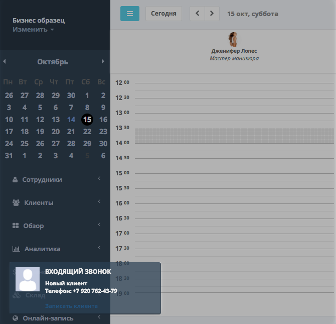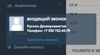 Интеграция с Облачной АТС позволит вам уже при входящем звонке видеть имя звонящего клиента и не переспрашивать номер телефона при записи. Вся история и записи звонков будут зафиксированы в карточке клиента.