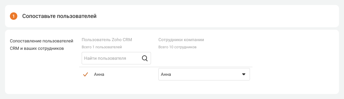 3. Сопоставьте всех пользователей АТС с пользователями Zoho, чтобы системы могли правильно отражать связанные с ними события. В Zoho CRM будут заноситься звонки только сопоставленных пользователей. При добавлении новых сотрудников в будущем тоже необходимо будет их сопоставить.