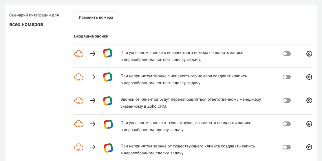 4. Вы можете настроить интеграцию для всех номеров сразу (этот вариант выбран по умолчанию) или для каждого в отдельности. Подробности — в статье «Настройка нескольких сценариев интеграции с CRM».